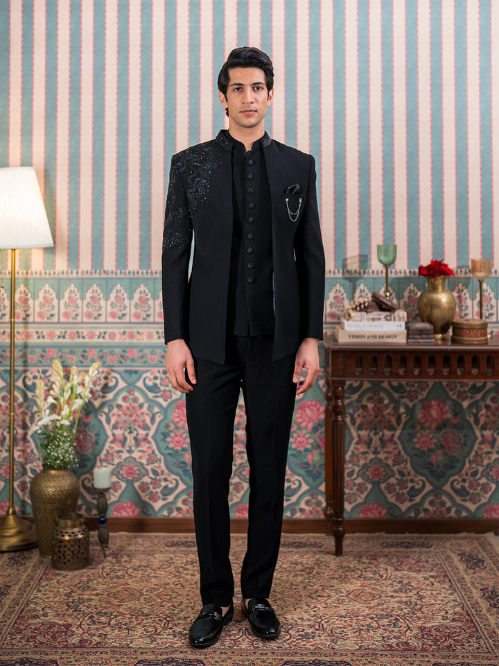 Black Jodhpuri Suit with Artisanal Cutdana Embroidery