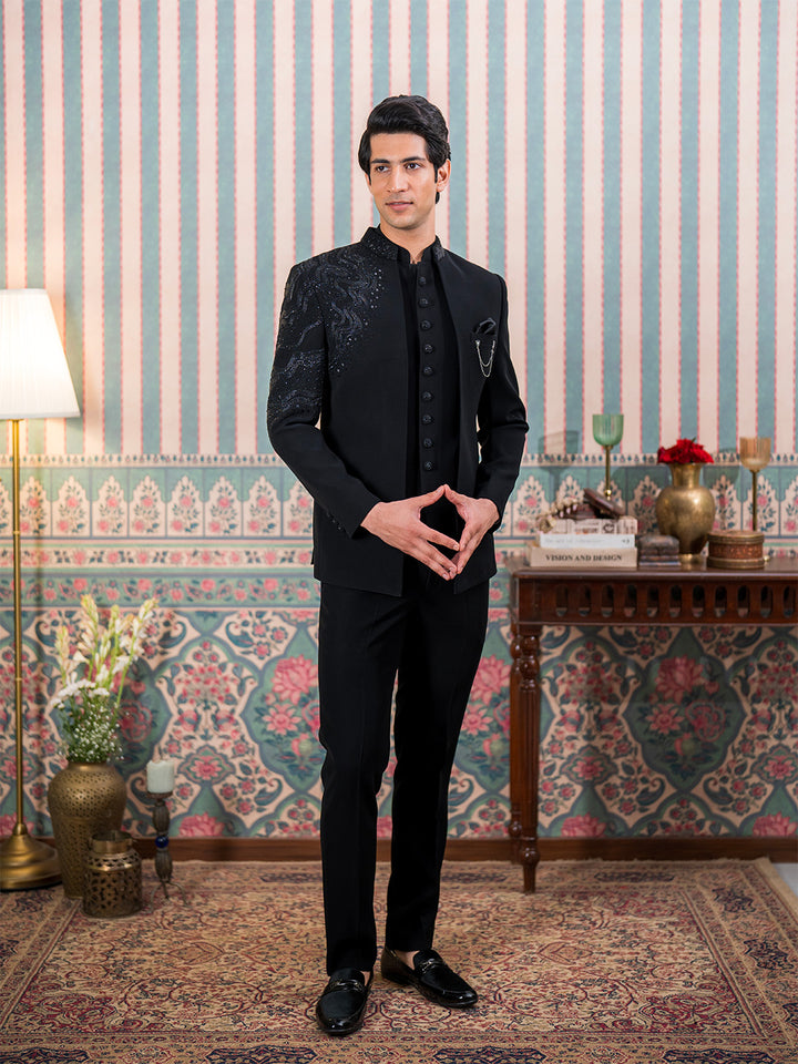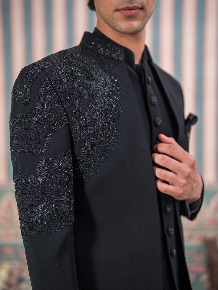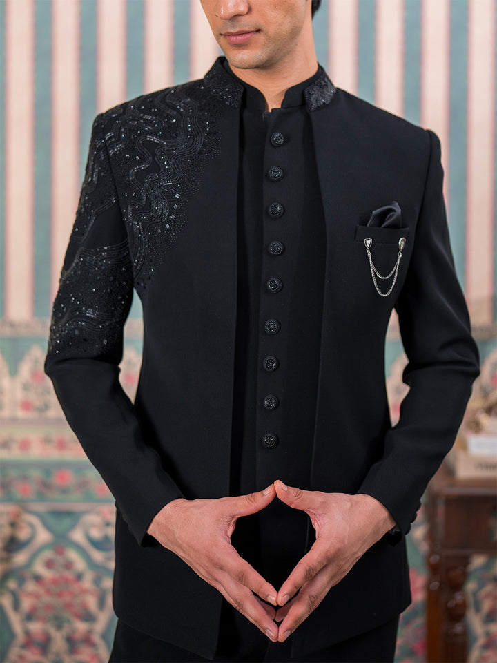 Luxurious black Jodhpuri suit featuring artisanal Cutdana embroidery on the shoulder, sleeves and neck. Perfect for Sangeet, Weddings, Receptions, and special occasions, presenting elegance and timeless sophistication.