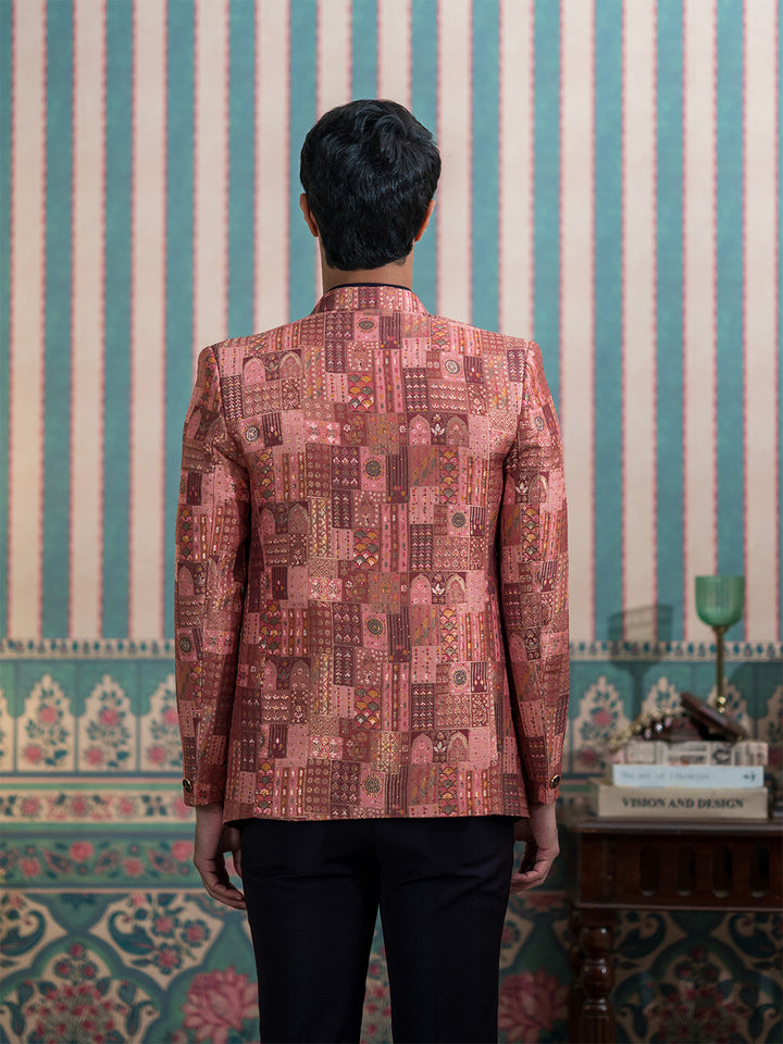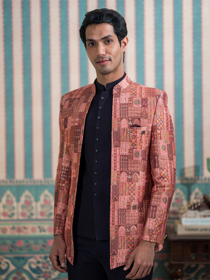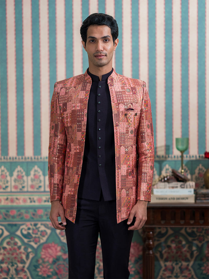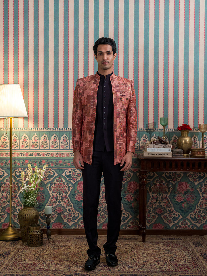 A luxurious maroon silk open Jodhpuri suit adorned with Indian heritage motifs and elegant stone work. Perfect for wedding and reception celebrations, radiating timeless royal charm.