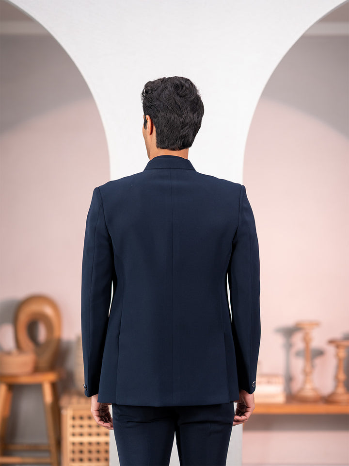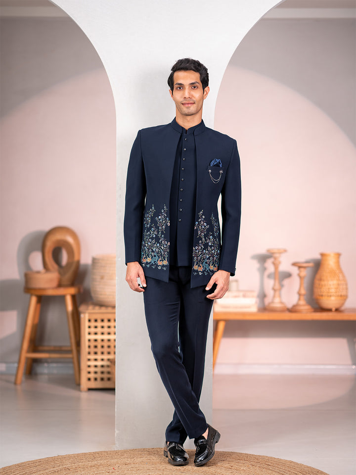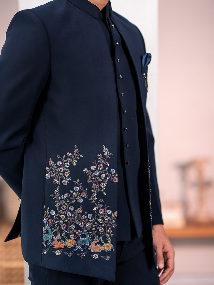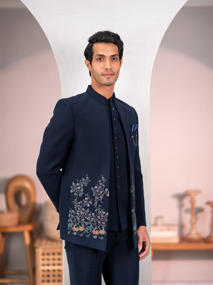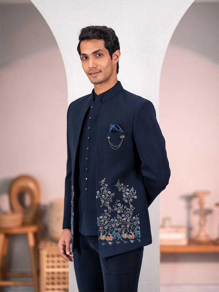 Navy blue Jodhpuri suit adorned with forest scenic rubber print and delicate hand embroidery. Perfect for Sangeet, Weddings, Receptions, and special occasions for a refined aesthetic.